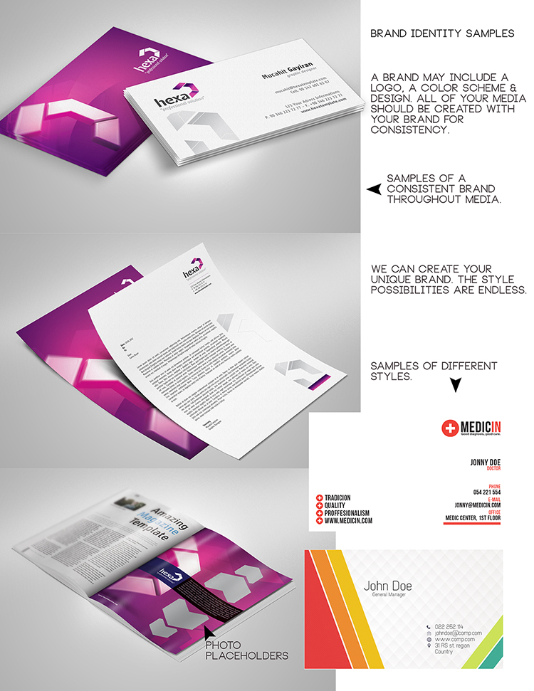 A brand identity is the look, color and feel of your company and remains constant through every visual asset.